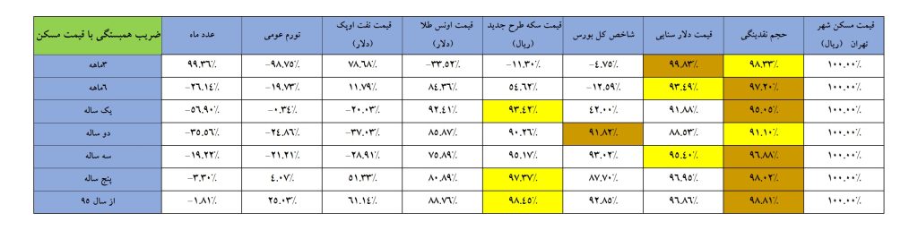 همچنین قیمت دلار تنها در بازه‌ سه‌ماهه نقش اصلی بر رفتار قیمت مسکن دارد (خانه‌ طلایی رنگ در جدول بالا) و در بازه‌های شش ماهه و سه ساله به عنوان دومین بازار و عامل بر مسکن (خانه زرد رنگ در جدول بالا) اثرگذار بوده است. پس می‌توان این گونه نتیجه‌گیری کرد که اگر قصد حضور کوتاه مدت ، سفته بازی و یا شروع سرمایه‌گذاری در بازار مسکن را دارید ، ابتدا به رفتاهـای بازار دلار و سکه توجه کنید چـرا کـه در کوتاه مدّت (زیر   سه ماه) بازار دلار و در بـازه تا شش ماه قیمت سکه است که نقش‌های اصلی را در تغیرات قیمت مسکن دارند.
