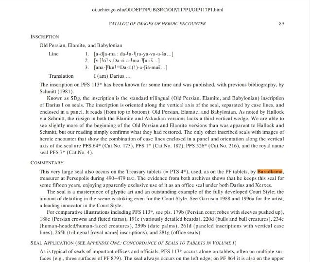 بارادکاما “یکی از خزانه داران بزرگ و معتمد سلسله هخامنشی بوده است.وی به دو پادشاه بزرگ ” داریوش کبیر” و جانشینش “خشایارشاه“خدمت کرده و از سال ۴۹۰ تا ۴۷۹ قبل از میلاد مسیح به عنوان مشاور ارشد مالی در ساخت “تخت جمشید “ فعایت داشته است.وی برای نظارت بر کار ساخت و ساز و امور مربوط به کارکنان به صورت دائمی در محل حضور داشته و خود شخصا بر تمام مصالح و کالاهای وارده به پروژه و ثبت و ضبط امور مالی رسیدگی می کرده است. به بیان امروزی ” بارادکاما “ به مدت یازده سال ” مدیر پروژه تخت جمشید” بوده است.